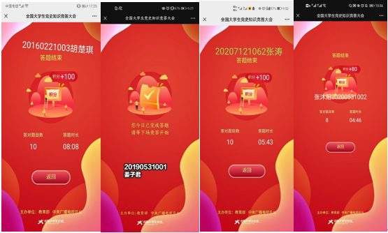 同步线上活动以“党史云答题”方式展开,采取分地区分时段、错峰错时线上云答题。让同学们更深入地了解党的初心与使命,各班同学踊跃参加本次党史答题,做到了全覆盖。