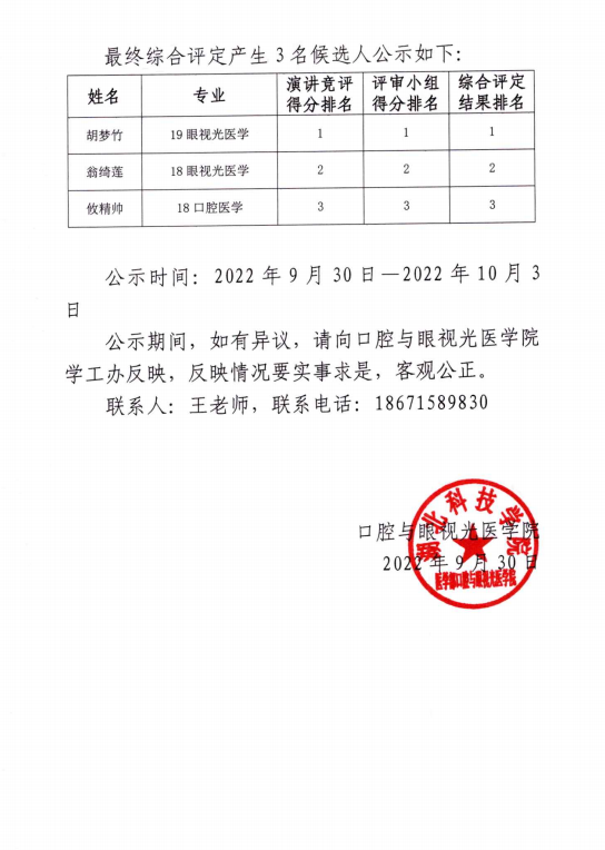 2022年beat365中文唯一官网学生评优评先综合素质测评成绩公示
