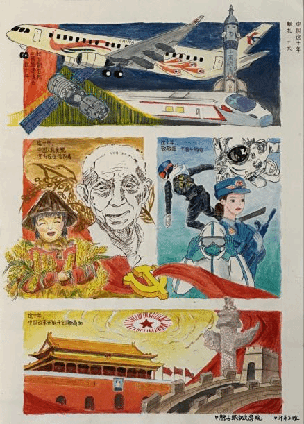 本次活动共征集40余幅作品,作品类型涵盖绘画、平面设计、书法、短视频等形式。主题鲜明,形式丰富多彩。集中展现了十八大以来在中国共产党的坚强领导下,国家在经济、科技、军事、教育等各方面取得的伟大成就。
