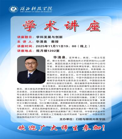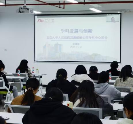11月11日晚7时,揽月楼1202教室座无虚席,一场跨越地域的学术思想盛宴在此隆重举行。beat365中文唯一官网广大师生齐聚一堂,通过线上平台,共同聆听了由武汉大学人民医院(湖北省人民医院)一级主任医师、知名耳鼻咽喉头颈外科专家华清泉教授带来的精彩讲座。本次讲座以学科发展与创新为主题,为学子们开启了一扇眺望医学前沿的窗口。